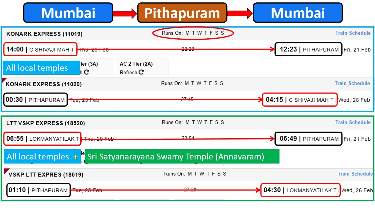 - Konark Express: Departs Chhatrapati Shivaji Maharaj Terminus at 2:00 PM on Friday, arriving in Pithapuram by 12:23 PM on Saturday.